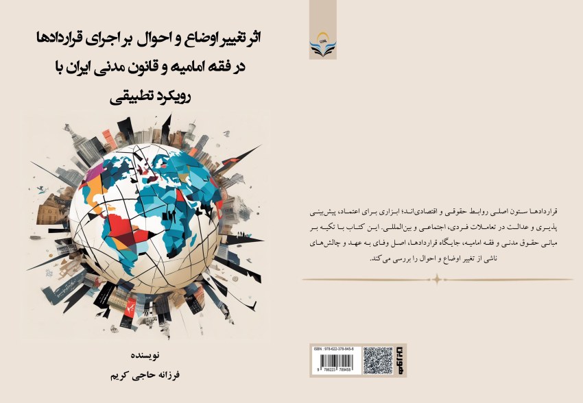 کتاب «اثر تغییر اوضاع و احوال بر اجرای قراردادها در فقه امامیه و قانون مدنی ایران با رویکرد تطبیقی» نوشته فرزانه حاجی کریم با شابک 978-622-378-945-8 و در 87 صفحه توسط انتشارات هورین منتشر شده است. این اثر به بررسی تأثیر تغییر شرایط و اوضاع بر اجرای تعهدات قراردادی در فقه امامیه و حقوق ایران میپردازد و با نگاهی تطبیقی، آموزههای نظامهای حقوقی مختلف را نیز تحلیل میکند.