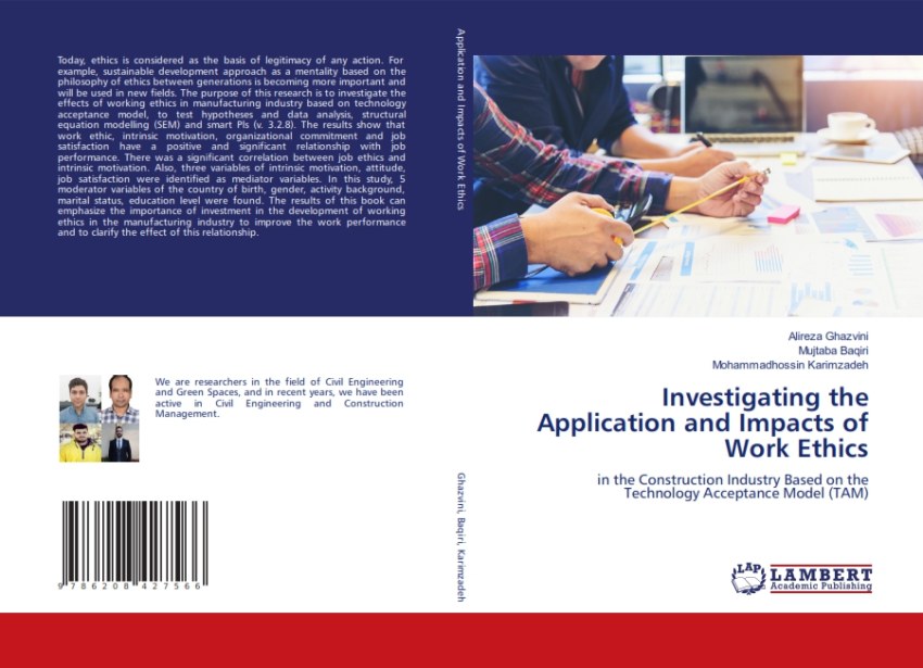 کتاب Investigating the Application and Impacts of Work Ethics in the Construction Industry Based on the Technology Acceptance Model (TAM) اثری تحلیلی و پژوهشی است که توسط علیرضا قزوینی، مجتبی باقری و محمدحسین کریمزاده نگاشته شده و در ۱۲۰ صفحه توسط انتشارات LAP LAMBERT Academic Publishing به چاپ رسیده است. این کتاب با شابک 978-620-8-42756-6 به بررسی عمیق پیوند میان اخلاق کاری و پذیرش فناوری در صنعت ساختوساز میپردازد و از چارچوب نظری مدل معروف TAM (Technology Acceptance Model) برای تحلیل رفتار حرفهای و نگرش کارکنان نسبت به فناوری استفاده میکند. ⚙️